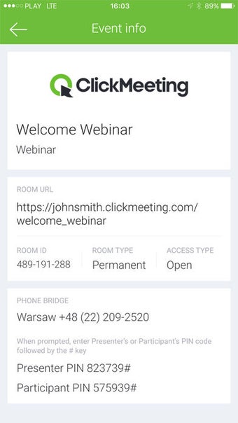 Informacje o spotkaniach seminariów internetowych ClickMeeting na iPhone'a